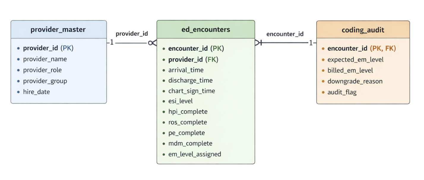 Entity Relationship Diagram showing relationships between encounters, providers, and coding audit tables. Primary keys and foreign key relationships are indicated.